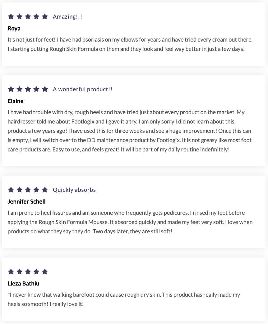 Use FOOTLOGIX® ROUGH SKIN FORMULA Mousse to improve the condition and appearance of your skin on the feet. Contains Urea to hydrate and lock moisture into the skin. The non-occlusive mousse formula is absorbed immediately & leaves no greasy residue.